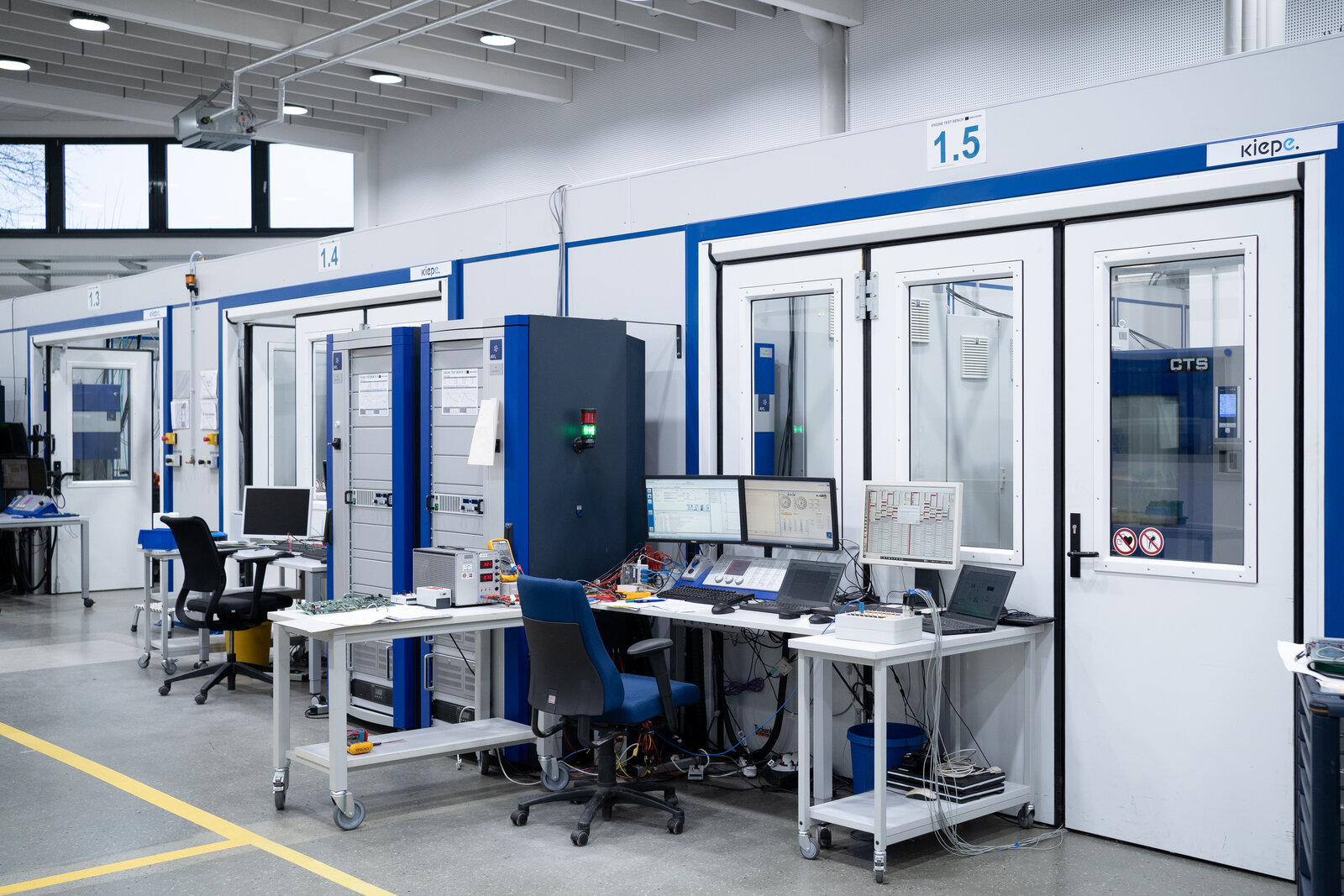 Im KIEPE Testcenter stehen leistungsfähige Prüfstände und eine umfassende Prüfinfrastruktur für die Prüfung elektrischer Antriebssysteme und leistungselektronischer Komponenten zur Verfügung. Die Prüfstände sind für hohe Leistungen, dynamische Lastprofile und unterschiedliche Anwendungsszenarien ausgelegt und ermöglichen reproduzierbare Prüfungen für Entwicklung, Validierung und Zulassung.